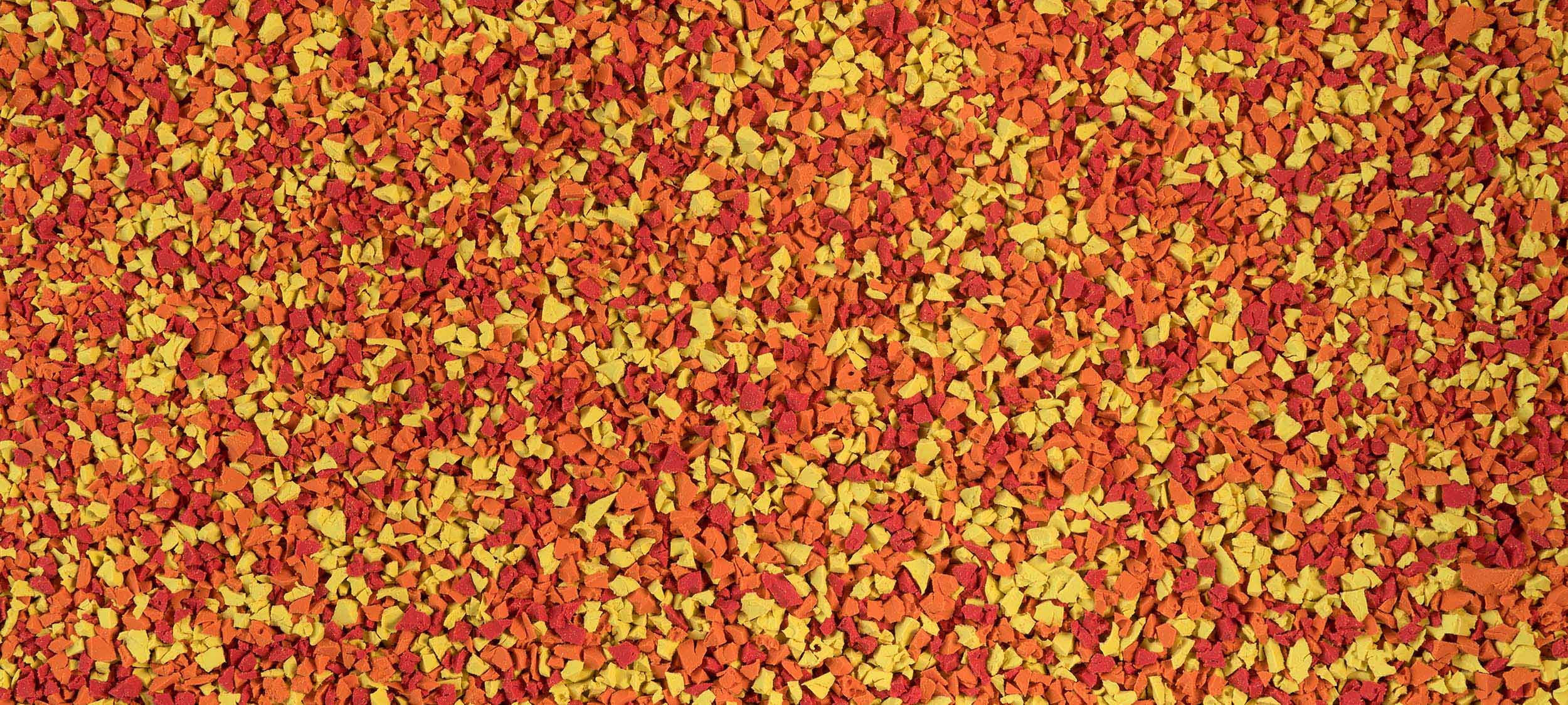 Vibrant three-colour blend creating warm, energetic surfaces ideal for play areas.